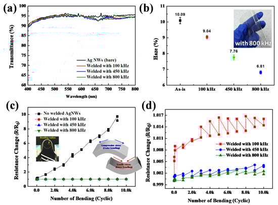 (a) Optical transmittance, (b) haze, and (c,d) resistance change with bending cycles of the Ag NW networks on PEN that were not, and were welded at 100, 450, and 800 kHz frequency at 6 kW for 60 s.