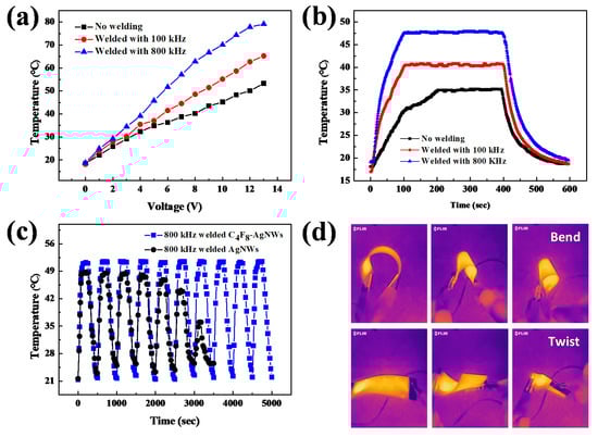 Using the Ag NWs coated PEN, THFs were fabricated, and their heater characteristics were investigated for the Ag NW networks before and after the welding at 100 and 800 kHz at 6 kW for 60 s, and Figure 7 shows the results. The sheet resistivity of the Ag NW network before the welding was ~100 ohm/sq, while after the welding at 100 and 800 kHz, the resistivities were decreased to ~90.6 and ~56.1 ohm/sq, respectively, without changing the optical transmittance. The temperature of the THFs was measured using a thermocouple attached to the surface of the THFs. Figure 7a shows the saturated temperature of the Ag NW-based THFs measured as a function of applied voltage.