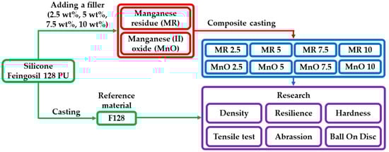 Encouraged by these results, the authors obtained manganese oxide and manganese residue from the Zakłady Górniczo-Hutnicze “Bolesław” S.A. Capital Group (Bukowno, Poland). These materials are waste products of the electrolysis process, when used with steel-lead alloy anodes. The authors examined the benefit of these waste products as fillers on the mechanical and tribological properties of composites, whose matrix was the same silicone that was used in the previous research. The use of waste materials from high-volume industrial processes is an important part of caring for the natural environment. Currently, paths for the recycling of waste in various branches of the economy are being sought. This will reduce the need to store and process industrial waste. The usage of waste materials from manganese processing as fillers is not mentioned in the available literature. The authors expect that, when used as a filler, the manganese residue (MR) product that is left over from the electrolysis reaction process, with anodes made of a silver-lead alloy, will reduce the abrasion of silicone-based composites. The physicochemical properties of the manufactured composites will be assessed, when both manganese (II) oxide and manganese residue are used as a filler.