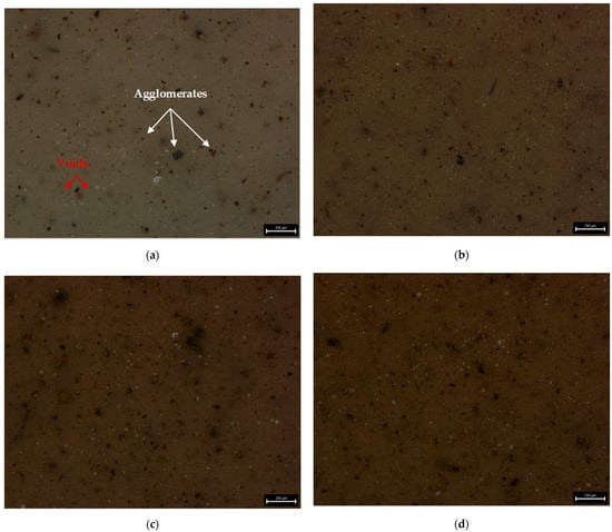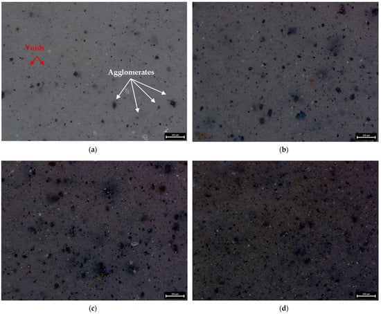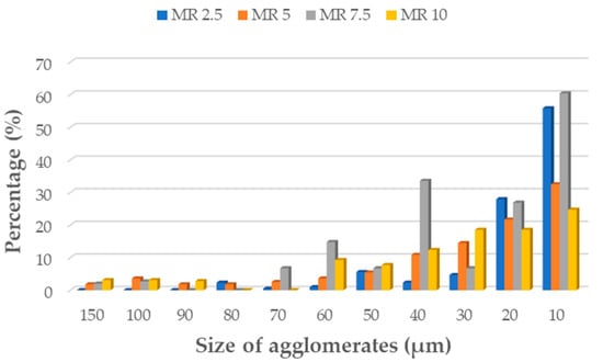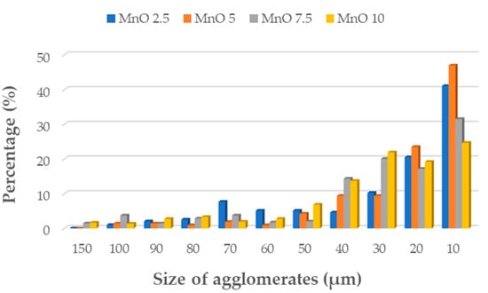 Figure 6) samples series, with increase concentration of filler, the MnO- and MR particles tend to form larger agglomerates in the matrix. For samples, with 5 and 7.5 wt% of MnO-filled silicone composites, the agglomerates with length more than 150 µm were observed. Similar trend was observed for MR-filled silicone composites. However, for both fillers, the largest share in the volume of agglomerates with a size in the range of 40–10 µm was observed. For samples with 10 wt% concentration of filler, smaller agglomerates were visible. Additionally, for all tested samples some voids also can be seen in the composites. The images were taken at magnification ×150.