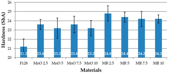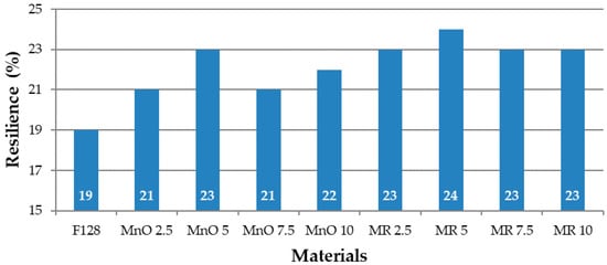 The value of resilience for the base material F128 is 19%, the lowest value among all tested materials. For the MnO 2.5 and MnO 5 composites, an increase in the value of resilience was recorded—21 and 23%, respectively. The MnO 7.5 material showed a decrease in resilience of 21%, while the MnO 10 material showed a slight increase, in comparison to the MnO 7.5 material (22%). For composites in which the filler was manganese residue, for MR 2.5 material, the rebound value was 23%. For MR 5, there was an increase in the value of resilience to 24%. The MR 7.5 and MR 10 materials were characterized by a slightly lower but equal rebound, amounting to 23%. As such, composites containing a manganese residue filler have similar values of resilience. The composite resilience increase in comparison to pure silicone is related to the use of fillers. The stiffness in the case of fillers is lower than that for silicone. Thus, the silicone mixed with fillers is more resilient than neat silicone.