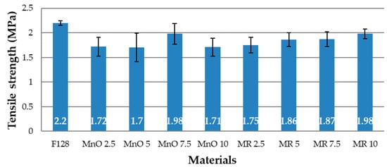 The tensile strength value for F128 silicone is 2.2 MPa, the highest value among all the tested materials. For the MnO 2.5 material, a decrease in the tensile strength value by 22% was observed, compared to the base material (1.72 MPa). The tensile strength value for the MnO 5 material, equal to 1.7 MPa, is similar to the value for MnO 2.5. For the MnO 7.5 material, a significant increase in the tensile strength value was observed in comparison with the two composites containing 2.5 and 5% of the filler in the structure. MnO 7.5 is characterized by a tensile strength value equal to 1.98 MPa. For the MnO 10 material, the tensile strength value decreased again to a value similar to that of MnO 2.5 and MnO 5 (1.71 MPa). For the composites that used a manganese residue filler, it was noticed that tensile strength increased, along with concentration of the filler. The tensile strength value for MR 2.5 is 1.75 MPa, MR 5—1.86 MPa, MR 7.5—1.87 MPa, and MR 10—1.98 MPa. The tensile strength value for MR 10 is equal to the MnO 7.5 value and both these values represent the highest tensile strength values among the tested materials.