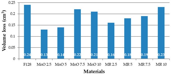 3). All the composite materials demonstrated lower abrasive wear. For the material using the filler MnO 2.5, an almost two-fold reduction in volume loss was observed (0.13 cm