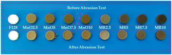 28]. For manganese compounds, the lowest abrasive wear is observed at the lowest filler concentrations. For composites with 2.5 wt% MnO share, a 46% decrease in abrasive wear is observed, while for composites with 2.5 wt% MR share, the decrease in abrasive wear was 33%.