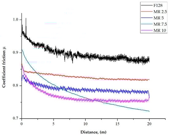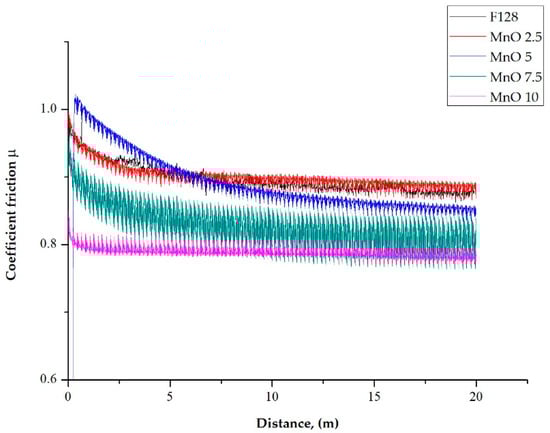 The coefficient of friction as a function of distance for test samples, with the addition of manganese oxide (MnO series) and manganese residue (MR series), is presented as a plot in