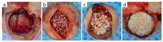 The bone graft materials applied to rat calvaria defects. (a) Control group, (b) Bio-Oss group, (c) Bone-XB group, and (d) S1-XB group.