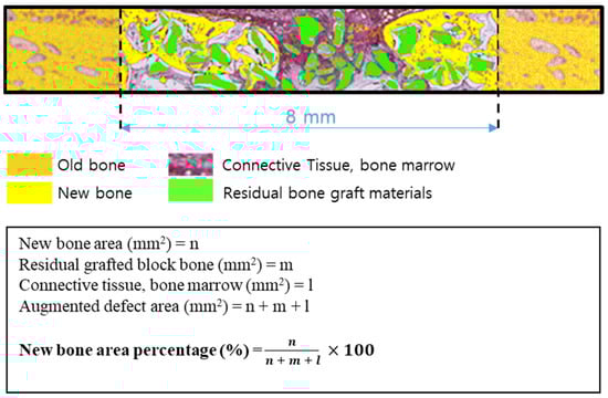 Specimens were decalcified using decalcifying Solution (Calci-Clear Rapid®, National Diagnostics, Atlanta, GA, USA) and dehydrated in an alcohol series (70%, 80%, 90%, and 100%) before they were embedded in paraffin. After that, the paraffin block was sectioned 3–4 μm thickness using a microtome(Leica® RM2255, Leica Biosystems Inc., Buffalo Grove, IL, USA). Slides were stained with hematoxylin-eosin and Masson’s trichrome and imaged under an optical microscope (Olympus BX51, Olympus Co., Ltd., Tokyo, Japan). New bone areas (%) were determined using an image analysis program (iSolution, IMT, Vancouver, Canada) (Figure 2).