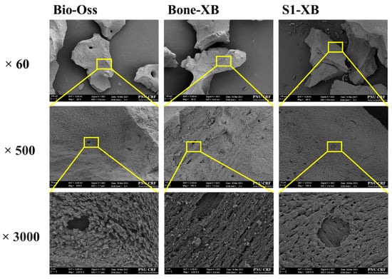 Images were taken at ×60, ×500, and ×3000 magnification to investigate the surface morphologies of bone graft materials. Similar particle sizes and macro-porous structures were observed for Bio-Oss, Bone-XB, and S1-XB. In S1-XB, distinct hydrogel layers were not visible on the SEM image (Figure 3).