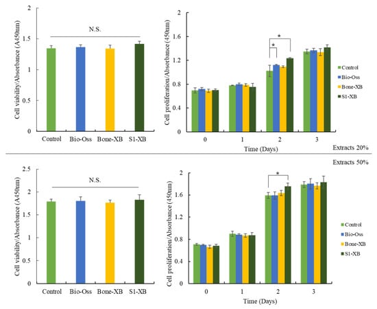 Cell viability and proliferation of human mesenchymal stem cells (hMSCs) exposed to the different extracts. The letter “*” indicates significant differences (p < 0.05); N.S.—No significant.