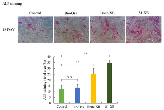 Cell osteogenic differentiation assay (** p < 0.01). The letter “**” indicates significant differences (p < 0.05); N.S.—No significant.