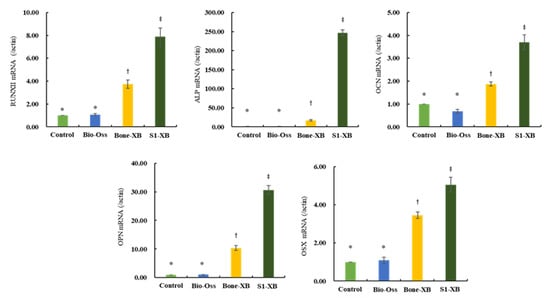 To evaluate the effects of the three bone substitutes on osteogenic differentiation further, qPCR was performed to examine the expressions of osteogenesis-related genes. Consistent with ALP staining results, supplementation of extracts derived from Bio-Oss did not induce any osteogenesis-related genes versus non-treated controls. However, supplementation of extracts derived from Bone-XB and S1-XB greatly induced expressions of the key osteogenic transcription factors Runx2 and OSX and those of genes involved in osteoblast differentiation and matrix mineralization; ALP, OCN, and OPN (Figure 6).