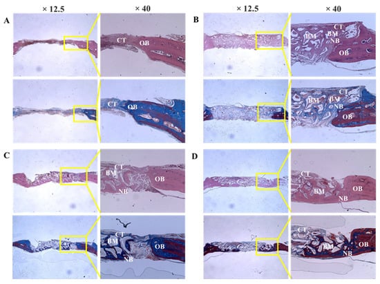 Histologic sections of defect sites at 8 weeks after surgery. (A) Control, (B) Bio-Oss, (C) Bone-XB, (D) S1-XB. Note: NB; new bone, CT; connective tissue, GM; graft materials, OB; old bone.