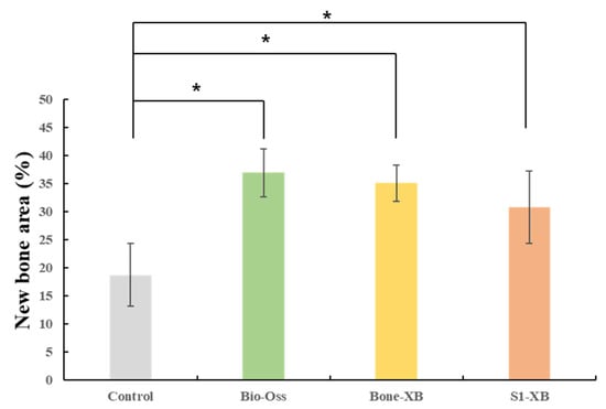 Percentages of new bone area within areas of interest (AOIs). The letter “*” indicates significant differences (p < 0.05).