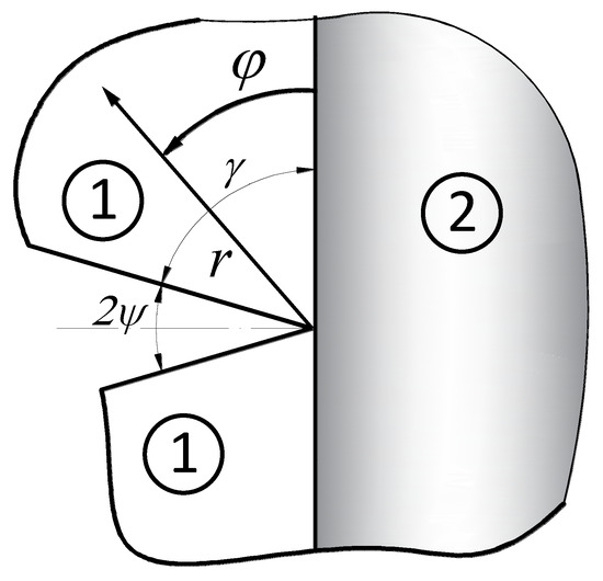 The analytical description of the stress fields was obtained by solving (with the accuracy of multiplicative constants called GSIFs) a plane problem of two connected elastic half-spaces, the interface of which is weakened by a sharp corner (Figure 1).