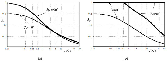 A solution of eigenequations (ν1 = ν2 = 0.3, plane stress condition), (a) for Mode I (7), (b) for Mode II (8).