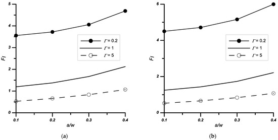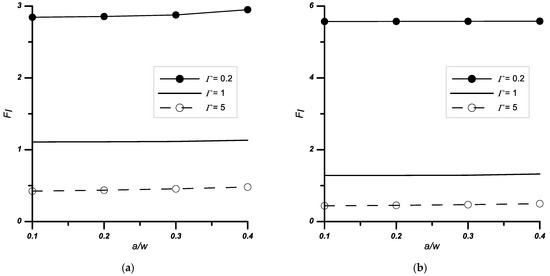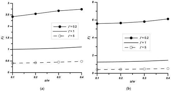 Variation of the normalised stress intensity factors FI with the relative stiffness Γ and notch height a/w, (a) notched bi-material with 2ψ = 0° apex angle, (b) notched bi-material with 2ψ = 90° apex angle.
