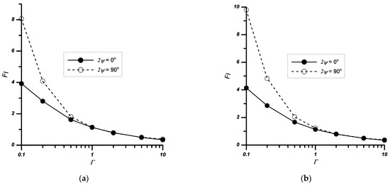 Variation of the normalised stress intensity factors FI with the relative stiffness Γ and the notch angle 2ψ, (a) for σx/σy1 = 1, (b) for σx/σy1 = 0.5, a/w = 0.4.