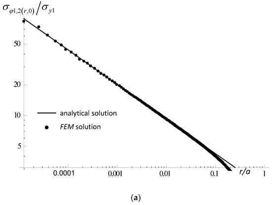 Comparison of selected stress distributions (pure shear loading) obtained by the FEM (points) and according to the analytical Formula (11) using the factors from Table 6, (continuous lines), (a) hoop stress, (b) tangential stress, (φ = 0°, 2ψ = 30°, Γ = 0.5).