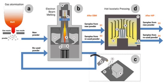 Figure 1 shows the design of the experiment: the gas atomized Ti-6Al-4V (new powder) used for EBM (Figure 1b); then after EBM the half of the produced samples have been used for S1-samples. Another half of as-built samples passed hot isostatic pressing (HIP) (see Figure 1d) and the S3-samples for characterization were prepared. The same workflow was for re-used powder. The powder that passed 69 cycles of additive manufacturing, has been used to prepare S2-samples (as-built without HIP), and for S4-samples—that were produced from re-used powder and passed HIP treatment.