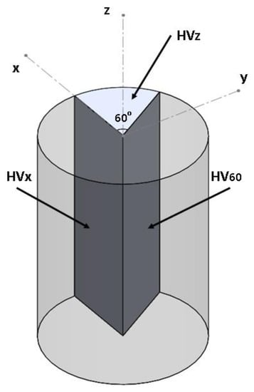 For the hardness test samples have been cut in three planes as it is shown in Figure 2. Samples were mounted in Bakelite and polished using SiC abrasive papers. Samples were not etched. Microhardness has been measured using Microhardness tester Future-Tech FM-110.