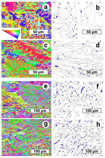 Microstructure of the alloy after EBM and HIP in the form of orientation maps (EBSD): Left column—of α-phase maps in Z-direction with standard color key; Right column—phase map with α-phase (white), interphase and intergranular boundaries (black lines), β-phase is indicated (blue); (a,b) S1; (c,d) S2; (e,f) S3; (g,h) S4.