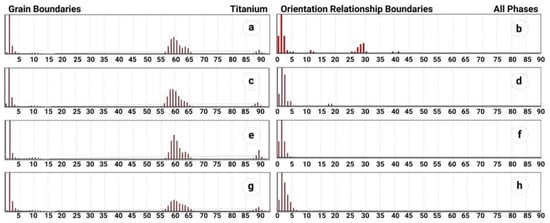 Spectra of grain boundaries by misorientation in the α-phase (left column) and deviations of interphase boundaries from Burgers OR (right column): (a,b)—S1; (c,d)—S2; (e,f)—S3; (g,h)—S4.