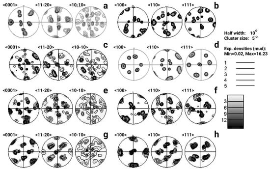 Pole figures <0001>, <11-20>, and <10-10> for α-phase (left column) and <100>, <110>, and <111> for β-phase (right column): (a,b) S1; (c,d) S2; (e,f) S3; (g,h) S4.