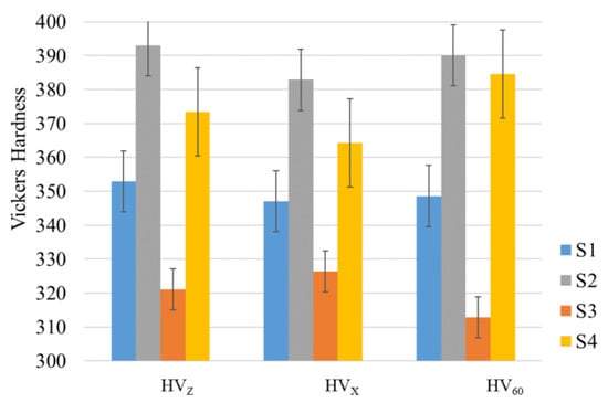 Vickers microhardness results for the four groups of the samples in selected planes.