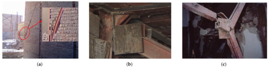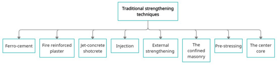 The emergence of wooden elements in the structure of masonry walls in ancient Greece following severe seismic occurrences is the earliest point in history that an attempt was made to establish a systematic technique for seismic resistance to structures [23]. Traditional reinforcing procedures occasionally fail to provide the structure with sufficient resistance to the maximum predicted seismic activity and result in modifications to the original constructive shape that are unacceptable from a cultural viewpoint. Strengthening using these approaches is frequently complicated, leading to disruption of usage, increased financial expenses, and, in some circumstances, unmanageability [24]. Figure 2 also depicts traditional reinforcing procedures for cultural heritage masonry constructions.