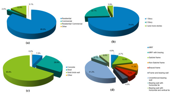 The details of Bam’s buildings prior to earthquake of 2003 [26]; (a) types of the buildings’ usage; (b) number of stories for buildings; (c) distribution of building types; (d) structural system types.