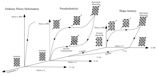 Stress–strain diagram of SMAs and the schematic crystal structures at different temperatures [54].