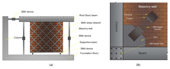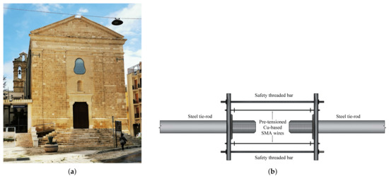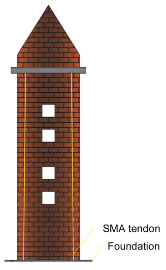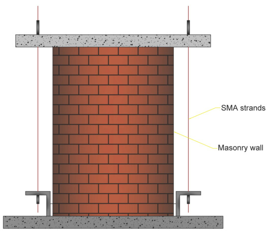Casciati and Hamdaoui [62] investigated the use of pre-tensioned SMA wires to retrofit historic masonry structures. They evaluated the structural aspects associated with the use of an SMA-based connection ties system as shown in Figure 10.
