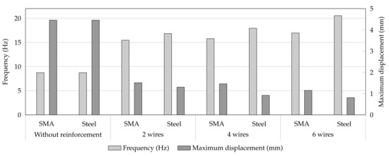 They compared different engineering factors between the usage of SMA and steel wires with the different number of used wires in the retrofitting of masonry wall under 20% of the El-Centro earthquake, which is demonstrated in Figure 11. These factors include frequencies and maximum displacement in systems without and with a different number of reinforcement (SMA or steel-based) wires. Furthermore, the equivalent modulus of elasticity (since Young’s moduli of the system’s elements are different, an equivalent value is elaborated) of the system without any wire was equal to 5875 MPa, whereas this value was recorded as 20,665, 19,180, and 22,100 MPa for the systems with 2, 4, and 6 SMA wires, respectively.