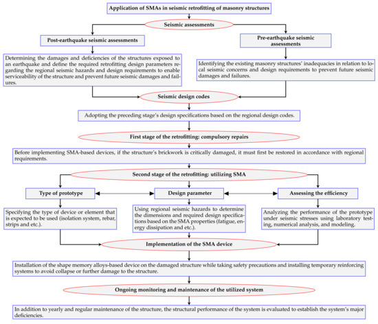 For decades, one of the most critical considerations of civil engineers has been the construction of structures that can sufficiently resist earthquakes. However, in many parts of the globe, ancient and contemporary buildings were constructed without regard for engineering; thus, there is a rising necessity to adapt existing structures to avoid accidents and preserve historical artefacts. There are various techniques for retrofitting a masonry structure, including foundation isolations, the use of Fibre-Reinforced Plastics (FRPs), shotcrete, etc. One innovative technique is the use of Shape Memory Alloys (SMAs), which improve structures by exhibiting high strength, good re-centring capabilities, self-repair, etc. One recent disastrous earthquake that happened in the city of Bam, Iran, (with a large proportion of masonry buildings) in 2003, with over 45,000 casualties, is analysed to discover the primary causes of the structural failure of buildings and its ancient citadel. It is followed by introducing the basic properties of SMAs and their applications in retrofitting masonry buildings. The outcomes of preceding implementations of SMAs in retrofitting of masonry buildings are then employed to present two comprehensive schemes as well as an implementation algorithm for strengthening masonry structures using SMA-based devices.