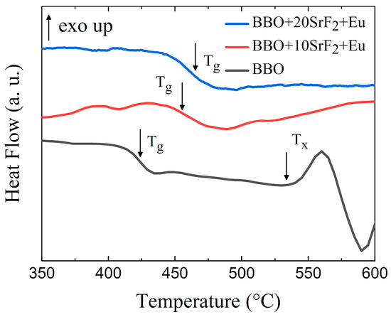 To analyze the thermal properties and the thermal stability of the prepared glasses, DSC measurements were performed. The results are presented in Figure 1. One can observe that the glass transition temperature depended on the SrF2 content. Tg was located around 424 °C, 456 °C, and 459 °C for BBO, BBO+10SrF2, and BBO+20SrF2 glasses, respectively. Interestingly, the exothermic maximum associated with crystallization was only visible for the BBO sample. The onset of crystallization peak temperature (Tx) was located at 534 °C, which is well below the crystallization temperatures of the possible crystalline phases [11]. The glass stability region ∆T, defined as the difference between Tx and Tg, for BBO glass was equal to 110 °C. This is a wide range, but even a small quantity of B2O3 may have a positive effect on the thermal stability of this glass [29]. Taking into account the crystallization of the glasses, the thermal stability S parameter describing the glass resistance against devitrification was also determined [30]: