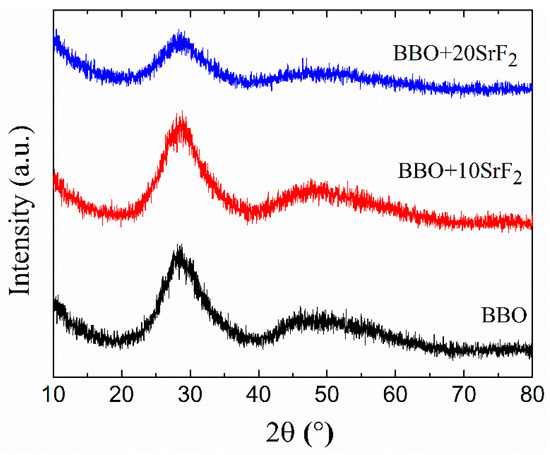 The amorphous character of as-prepared glasses was confirmed by XRD studies. Figure 2 shows the diffraction patterns of BBO, BBO+10SrF2, and BBO+20SrF2 glass samples. Only broad halos associated with amorphous materials can be seen.