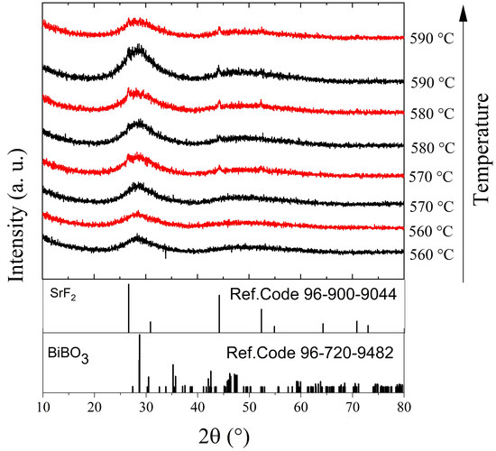 The effect of the annealing temperature on the structure of the BBO+10SrF2 and BBO+20SrF2 glasses is shown in Figure 3 and Figure 4. In Figure 3, X-ray diffractograms for the BBO+10SrF2 and BBO+20SrF2 glasses annealed at temperatures ranging from 560 to 590 °C for 1 h are presented. Figure 4 presents XRD patterns of these glasses after heat treatment in the same temperature range, but for 24 h. The aim of the thermal treatment was the growth of SrF2 nanocrystals in the glass matrix. XRD patterns of the samples annealed at 560 °C did not differ from the patterns of the unannealed samples and showed a lack of long-range order. It should be noted, however, that in the presented XRD results a small amount of the nano-sized crystalline phase could have gone unnoticed, especially since the amorphous phase in which the nanocrystals were dispersed gives a broad halo in the range of 25–35 (2θ), in which there may be major reflections derived from the crystalline phases. Clear differences between BBO+10SrF2 and BBO+20SrF2 samples appeared after annealing at 570 °C. XRD patterns of the BBO+10SrF2 sample showed crystallization mainly in the BiBO3 phase (Ref.Code 96-720-9482), but there were also visible low-intensity reflections corresponding to the SrF2 phase (Ref.Code 96-900-9044). Unfortunately, there were also unidentified peaks in the diffractograms that were likely related to bismuth oxides, but crystalline borates sometimes have highly unusual stoichiometries [8]; therefore, it is difficult to fully characterize the presented diffraction pattern. On the other hand, BBO+20SrF2 samples showed only the peaks characteristic of the SrF2 crystalline phase (Ref.Code 96-900-9044). As can be seen, with the increase in the annealing temperature, the amount of BiBO3 crystalline phase in the BBO+10SrF2 samples decreased, whereas a weak reflection of the SrF2 phase was already present in the sample annealed at 580 °C. In the case of the annealed BBO+20SrF2 glass, the SrF2 phase crystallized regardless of the temperature increase. The obtained diffractograms confirm the conclusion drawn based on DSC studies that the presence of SrF2 in the BBO matrix prevented its crystallization. Unfortunately, annealing the samples at temperatures of 570 °C and higher caused them to begin to lose their transparency. Therefore, 560 °C was chosen as the temperature, providing a compromise between the transparency of the sample and the presence of a crystalline phase in it. At this temperature, only samples heated for 24 h became opaque.