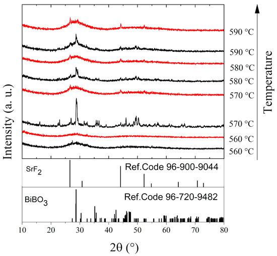 XRD patterns of BBO+10SrF2 (black) and BBO+20SrF2 (red) glasses after annealing in the temperature range of 560–590 °C for 1 h.