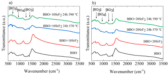 FTIR spectra of BBO+10SrF2 (a) and BBO+20SrF2 (b) as-prepared glasses and glasses after annealing at 570 °C and 590 °C. For comparison, the spectrum of as-prepared BBO glass was added to each figure.
