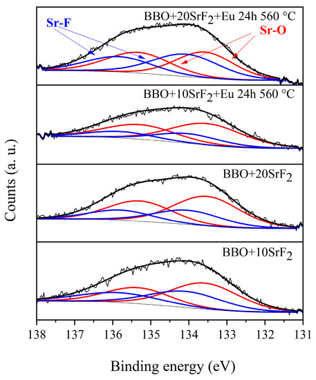 XPS analysis was performed to provide additional information about the valence states of the elements of which the samples consisted. Particular emphasis was placed on the study of the valence states of Eu and Bi ions, as well as the chemical states of Sr that could indicate Sr chemical bonds with both fluorine and oxygen [24,34,35]. As research has shown, both Eu and Bi ions are in the 3+ valence state. Exemplary spectra of the Sr region of BBO+10SrF2 and BBO+20SrF2 glasses and glass ceramics after annealing at 560 °C for 24 h are shown in Figure 6. All spectra consisted of the Sr 3d spin-orbit doublet, but a detailed analysis of these peaks suggests the presence of more than one chemical state of Sr in all samples. Peaks at 133.5 and 135.5 eV could be assigned to the Sr 3d5/2 and Sr 3d3/2 in Sr-O [34,35], whereas peaks with energies equal to 134.0 and 136.0 eV could be attributed to Sr 3d5/2 and Sr 3d3/2 in Sr-F [34,35]. The contribution of Sr-O and Sr-F doublets in the glasses was 59% and 41% (BBO+10SrF2) and 67% and 33% (BBO+20SrF2), respectively. The contribution of Sr-O and Sr-F doublets after annealing was, respectively, 80% and 20% (BBO+10SrF2) and 52% and 48% (BBO+20SrF2). Therefore, as can be seen, annealing did not change the ratio of the doublets in the same way in both samples. The increase in the contribution of the Sr-F doublet, which in turn indicated an increase in the amount of the SrF2 crystal phase in the matrix, only took place in samples containing 20 mol % SrF2. However, as the analysis of the X-ray diffractograms showed, SrF2 as the only crystalline phase was also present only in the samples containing 20 mol % SrF2. Therefore, it can be concluded from both of these methods that the formation of SrF2 nanocrystals hindered the crystallization of the matrix.