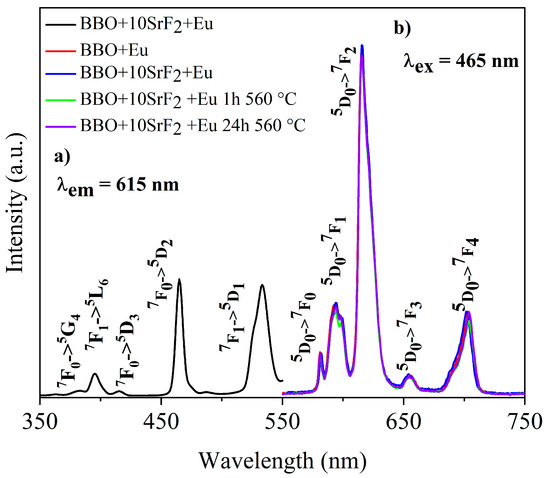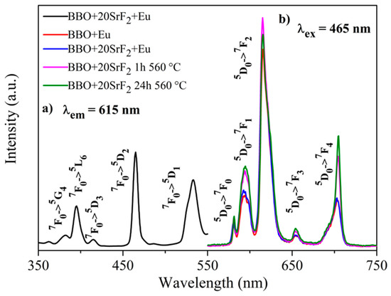 Luminescence properties of Eu-doped BBO, BBO+10SrF2, and BBO+20SrF2 glasses and glass-ceramics were investigated to determine the influence of SrF2 on the luminescence intensity of Eu3+ ions. Figure 7a and Figure 8a show the excitation spectra of as-prepared BBO+10SrF2+Eu and BBO+20SrF2+Eu glasses monitored at the wavelength of λem = 615 nm, which corresponds to 5D0 → 7F2 transition of Eu3+ ions [3,36]. Several characteristics for 4f-4f transition peaks were visible in the spectrum. Excitation bands at 382 and 465 nm may have been assigned to 7F0 → 5G4, 5D2 transitions, whereas bands at 396, 415, and 533 nm originated from 7F0 → 5L6, 5D3, and 5D1 transitions, respectively [3,36]. A wavelength of 465 nm was selected for the observation of the emission spectra. This is the line with the highest intensity in the excitation spectrum. Emission spectra of BBO+10SrF2+Eu glass and glass-ceramics crystallized at 560 °C (Figure 7b) consisted of several bands corresponding to Eu3+ radiative transitions at 581 nm (5D0 → 7F0), 594 nm (5D0 → 7F1), 615 nm (5D0 → 7F2), 655 nm (5D0 → 7F3), and 703 nm (5D0 → 7F4) [3,36]. As can be seen, there were no significant differences between the intensity of the bands corresponding to the BBO+Eu glass and the glass with the addition of 10 mol % of SrF2. In addition, annealing of the BBO+10SrF2+Eu samples did not change the intensity of the spectral lines. However, if we look at the results concerning the structure of the annealed samples, the crystallization of the borane-bismuth matrix, apart from the SrF2 crystal phase, cannot be ruled out. Assuming that this is the case, the emitted radiation could undergo scattering on defects. Looking at the emission spectra corresponding to the BBO+20SrF2+Eu samples (Figure 8b), it can be noticed that the emission bands were at the same wavelengths as for the samples with 10 mol % of SrF2. In addition, it is evident that annealing affected the intensity of Eu3+ ions emission. It is worth noticing that the SrF2 crystalline phase was characterized by considerably lower phonon energy compared to the oxide materials. Therefore, if Eu3+ ions are located in the SrF2 nanocrystals, this leads to a decrease in multi-phonon relaxation probability, and consequently to an increase in emission efficiency. This was also the case with other strontium fluoride-containing glass ceramics [25,37].