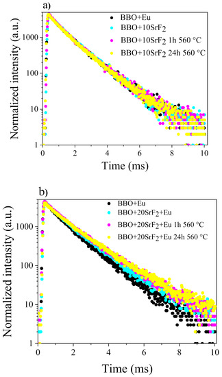 Luminescence decay analysis was performed on as-prepared Eu doped BBO, BBO+10SrF2 and BBO+20SrF2 glasses and glass-ceramics. The decay curves were obtained by monitoring 5D0 →7F2 emission line (λem = 615 nm) upon excitation at λexc = 465 nm (7F0 →5D2 transition) and are shown in Figure 9a,b.