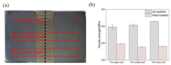 (a) Test positions of the upper, middle, and lower parts; (b) comparison of tensile strength between the as-welded and heat-treated joints.