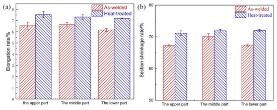 Figure 4 shows the changes in the section shrinkage rate and the elongation rate of the as-welded and heat-treated joints. From Figure 4a, it can be seen that the elongation rate of the upper, middle, and lower parts of the welded joint was equal to about 6.4%, and the elongation rate of the upper, middle, and lower parts of the heat-treated joint was equal to about 7.4%. The heat-treatment elongation rate was 13.5% greater than the as-welded elongation rate. It can be seen from Figure 4b that the section shrinkage rates of the upper, middle, and lower parts of the as-welded joints were roughly the same, with an average of 68.3%, and the heat-treated section shrinkage rate of the upper, middle, and lower parts were roughly the same, at about 71.7%. The heat-treatment section shrinkage rate was 4.74% greater than that of the as-welded state.