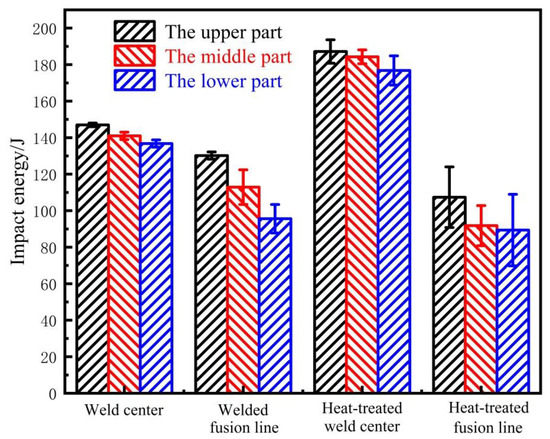 Figure 3a shows test positions of the upper, middle, and lower parts of the metal. To study the effect of heat treatment on the tensile properties, the tensile properties of the upper, middle, and lower parts of the weld were individually tested. To study the impact of heat treatment on the impact properties of the weld center and the fusion line, the upper, middle, and lower parts of the weld were individually subjected to an impact performance test. In the experiment, we extracted the impact samples at the center of the weld seam and the fusion line, and the sizes of the two samples were the same. Of these, the sample at the fusion line was extracted by aligning the fusion line with the v-shaped notch, and the sample at the welding seam was extracted by aligning the center of the weld with the v-shaped notch. Figure 3b shows the changes in tensile strength of the welded and heat-treated joints. The results showed that the tensile strength of the upper, middle, and lower parts of the as-welded joint was approximately equal to 605 MPa; after heat treatment, the tensile strength of the upper, middle, and lower parts was approximately equal to 543 MPa. The tensile strength of the as-welded joint was 10.2% greater than the heat-treated tensile strength.