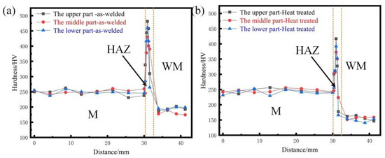 Figure 6 shows the changes in the microhardness of as-welded and heat-treated joints. Figure 6a,b shows that the hardness of the upper, middle, and lower parts of the joint did not change significantly. The average hardness value of the weld center of the as-welded seam was about 18.7% greater than that of the heat-treated joint, and the average hardness value of the as-welded heat-affected zone was about 21.1% higher than that of the heat-treated value. The hardness of the weld state at base metal was equal to that of the heat-treated metal.