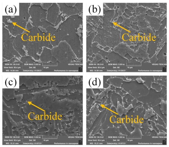 Figure 7 shows the SEM microstructure analysis of the weld center in the as-welded and heat-treated metal. From Figure 7a,c, it can be seen that after heat treatment, the columnar crystal regions along the grain boundaries of the larger carbides transformed into a large number of fine particles. From Figure 7b,d, it can be seen that after heat treatment, a large number of fine and dispersed granular carbonizations were precipitated at the subgrain boundary in the fine-grained region. In summary, this was mainly because the carbide was dissolved during heating, and then dispersed and precipitated during the cooling process. The fine granular carbides pierced, and hindered the movement of, the dislocations, thereby improving the toughness of the joint after heat- treated. And during the heat- treated, the granular bainite evolved to a softer ferrite matrix. Therefore, after heat- treated, the tensile strength and hardness of the weld decreased, but the toughness increased.