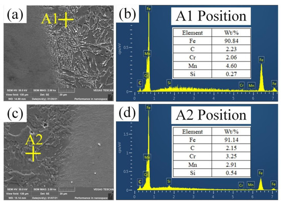 Microstructure analysis at the fusion line: (a) SEM images of the as-welded joint; (b) the EDS result of point A1 in (a); (c) SEM images of the as-welded joint; (d) the EDS result of point A2 in (c).
