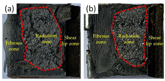 Figure 10 shows the micromorphology of the impact test fracture surface. According to Figure 10a, the left side of the impact fracture in the as-welded joint was the fibrous zone, which was the starting point of the crack. In the middle was the radiation zone, which was the crack propagation zone. On the right was the shear lip zone, which was completely fractured. It can be seen from Figure 10b that the fracture mode after heat treatment was the same as that of the as-welded joint.