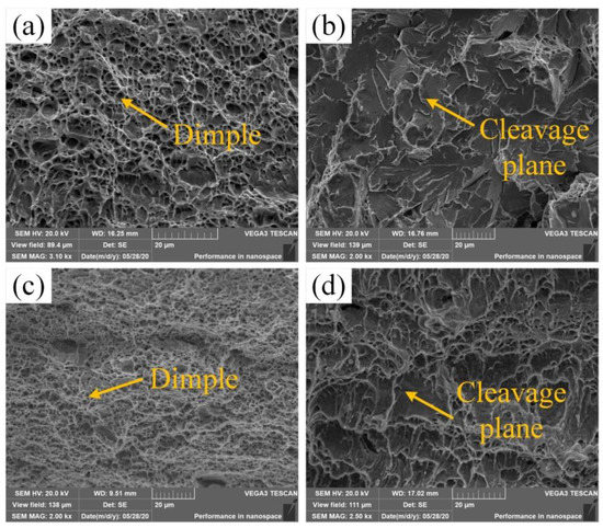 SEM was used to characterize the microstructure of the as-welded and heat-treated samples, and to evaluate their fracture modes. Figure 11 shows the fracture morphology of the weld center of the as-welded and heat-treated joints. As seen in Figure 11a, The weld center fibrous zone of the as-welded joint showed a large number of dimples, which characterized a ductile fracture; in Figure 11b, the weld center radiation zone of the as-welded joint showed a large number of cleavage planes, which characterized a brittle fracture; in Figure 11c, the weld center central fibrous zone of the heat-treated joint showed dimples that were smaller and more numerous than those of the as-welded joint. Therefore, the toughness was greater than that of the as-welded joint; in Figure 11d, of the weld center radiation zone of the heat-treated joint, the zone of the cleavage planes were relatively small. In summary, after heat-treated, the fracture mode was converted from a brittle fracture failure mode to a combination of a brittle fracture and a ductile fracture. Therefore, the impact performance of the weld center after heat treatment was better than that of the as-welded joint.